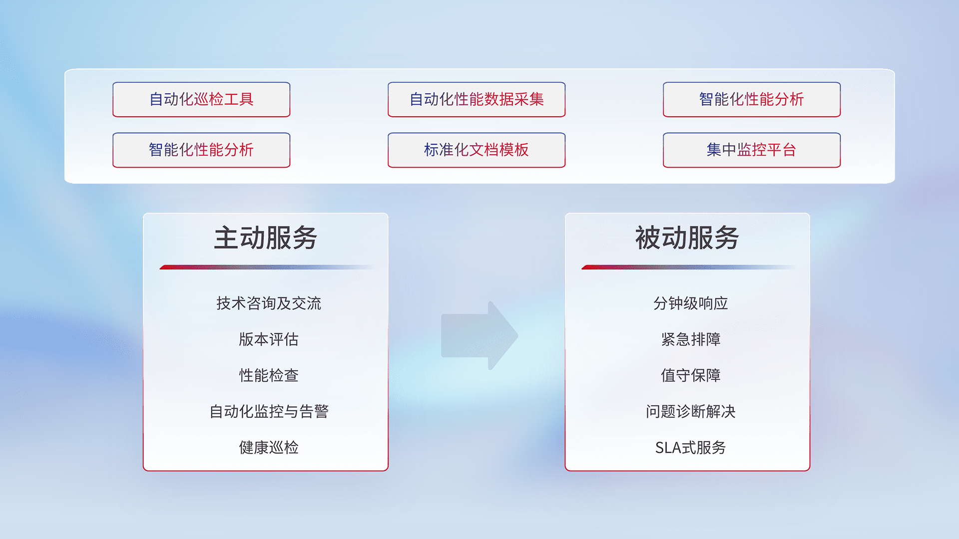 智能化工具和标准化文档,,,,保障服务质量,,,,提供主动服务(包含技术咨询、、、版本评估、、性能检查、、自动化监控与告警、、、、健康巡检)和被动服务包含(分钟级响应、、、紧急排障、、、值守保障、、问题诊断解决、、、、SLA服务)。。