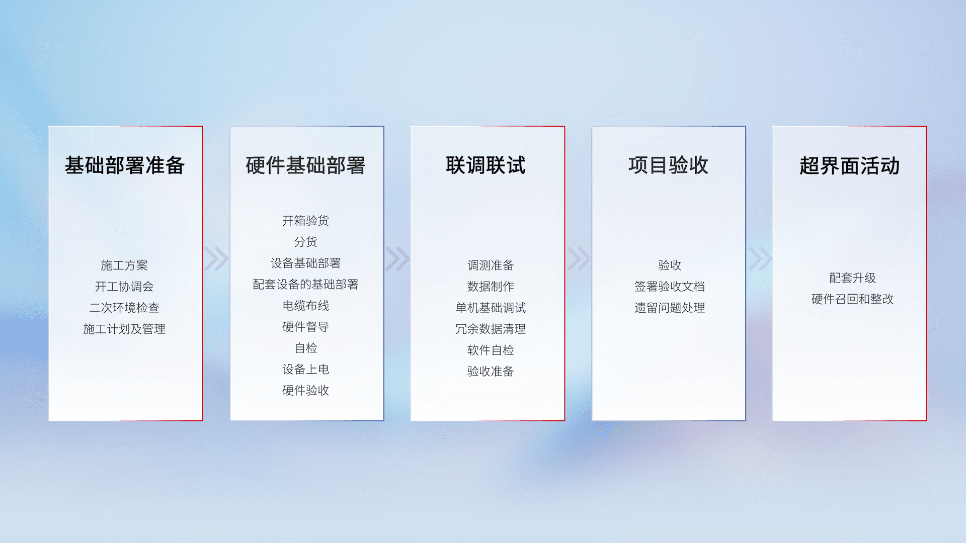从基础部署准备、、、硬件基础部署、、、、联调联试、、项目验收、、越界面活动的全过程可追溯,,,保证施工质量和进度。。